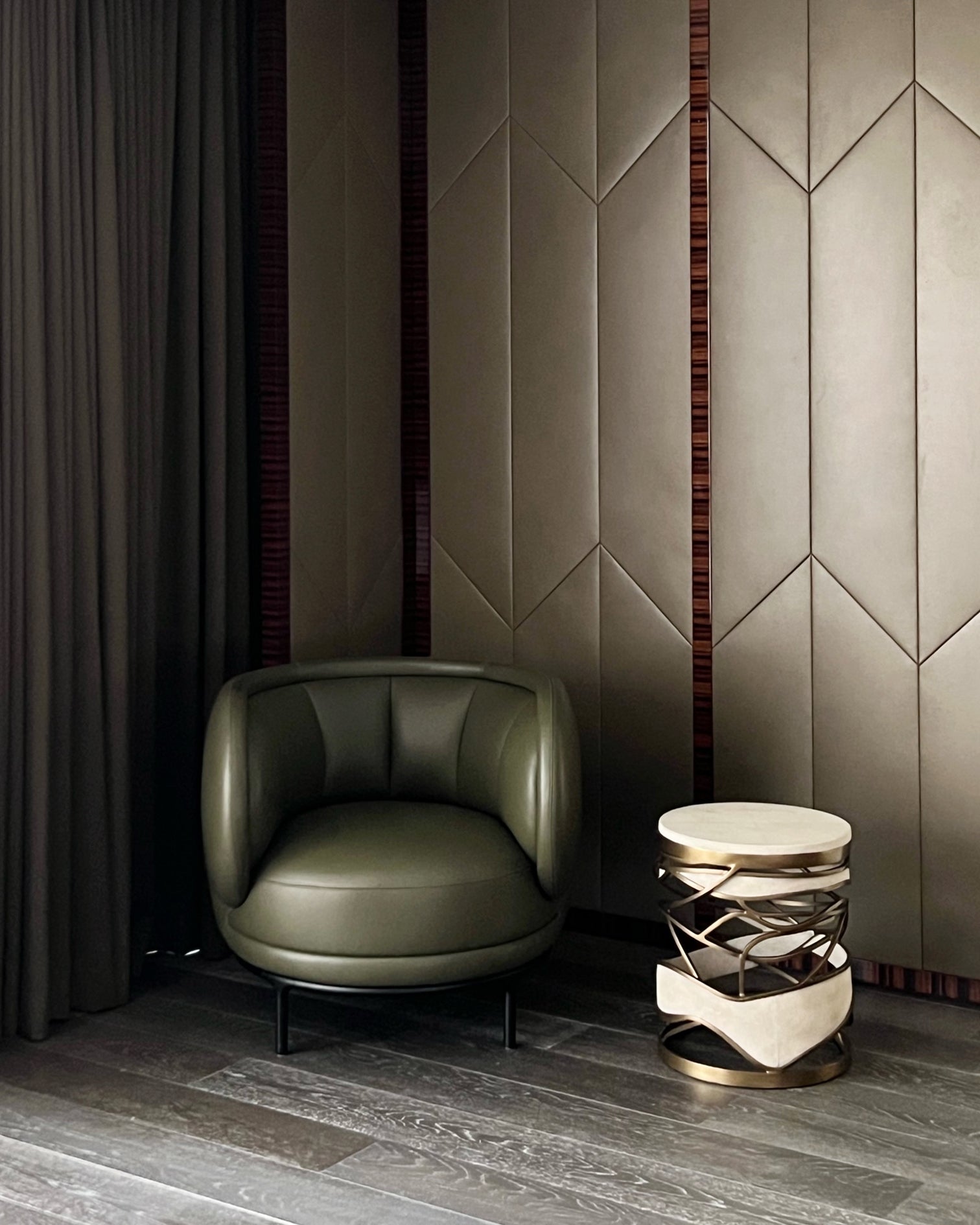 CONTEMPORARY POLISHED CAST BRASS CHAIR WITH UPHOLSTERED CALICO SEAT